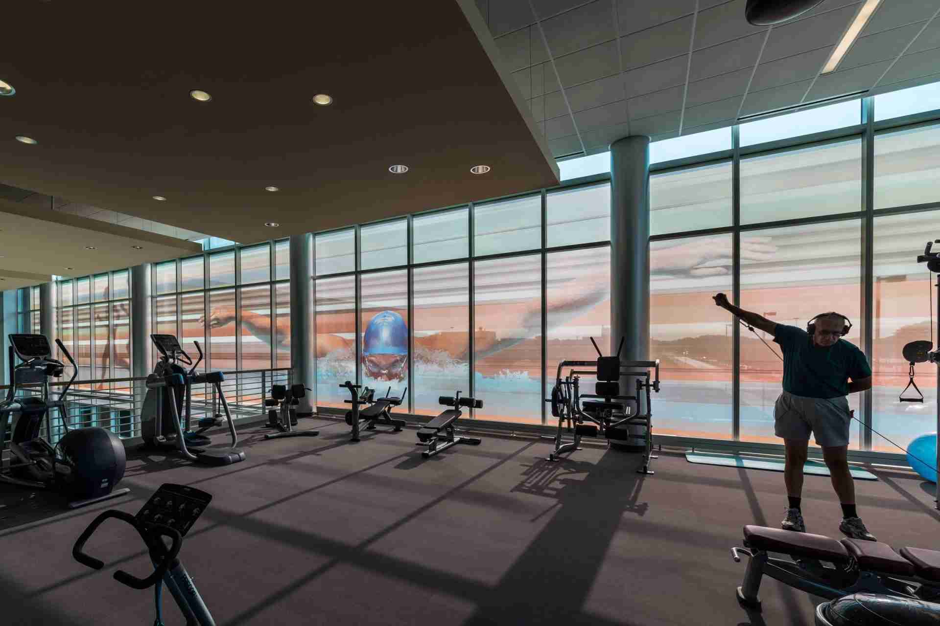 The challenge with this project was the architect’s vision of a design that could be viewed from the exterior, without obscuring the visibility when looking out from inside the fitness center. Goldray was able to provide a solution to this quandary by proposing a very specific dot pattern be used when printing. This arrangement of dots allows clear vision from the inside of the building, yet providing a uniform mural like display on the outside. Patrons using the facilities in the morning are privy to a most spectacular view of the sun rising up over the image of the swimmer.