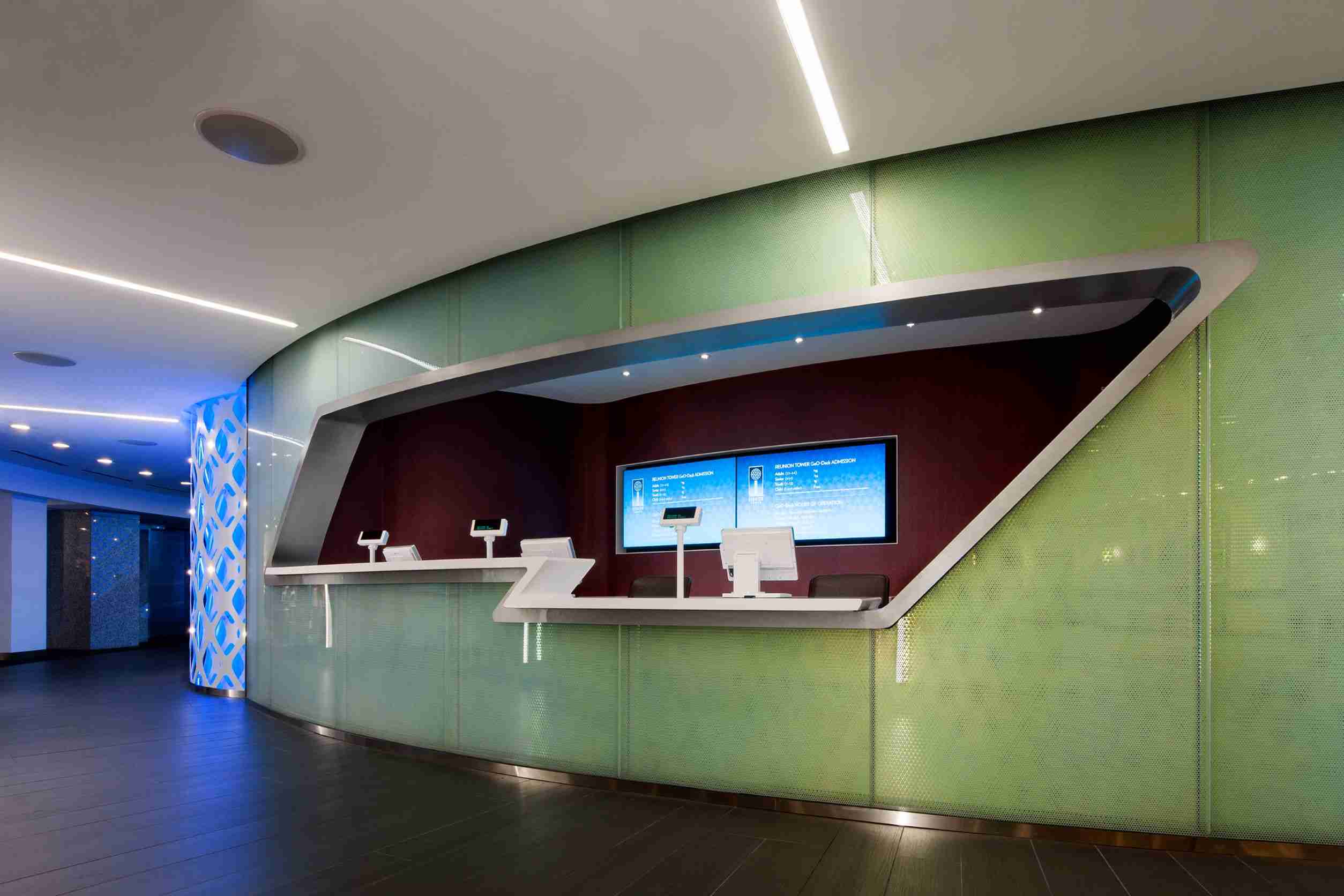 Goldray was specified to manufacture luxury glass finishing for this stunning hotel lobby. The sleek, opaque black backpainted glass walls frame the stairwell and surround the sophisticated sitting area and concierge. On the reverse of these partitions is a contrasting glossy, white backpainted glass application. The reception area has a completely different atmosphere depending on which side of the decorative glass installation you are on. When guests first arrive, they are greeted with the darker ambiance, but as they round the corner to ride the escalator or take the stairs, the ambiance changes to light and airy.