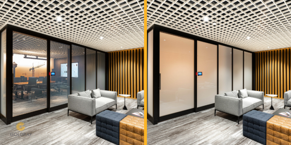 Goldray Glass’ QuickFrost is made by laminating a Polymer-Dispersed Liquid Crystal (PDLC) film between two glass lites and attaching the glass to a power source. When an electric current is applied to the film, the Liquid Crystal Display (LCD) particles react, causing the crystals within the film to align and the glass to appear in it’s non-privacy state. In it’s “off” state, with no electricity applied, the crystals will revert back to their original position in the film, offering enhanced privacy as the view through the glass is obstructed. In recent years, new films have been produced that require less electricity to activate the LCDs, improving the overall clarity of the glass in it’s non-privacy state. Goldray Glass uses the latest generation of switchable film, ensuring a high-quality product that is more accessible to architects and designers than ever before.